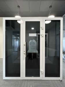 - Фасадна частина склопакет з тонованого в сірий колір скла в алюмінієвій рамці білого кольору