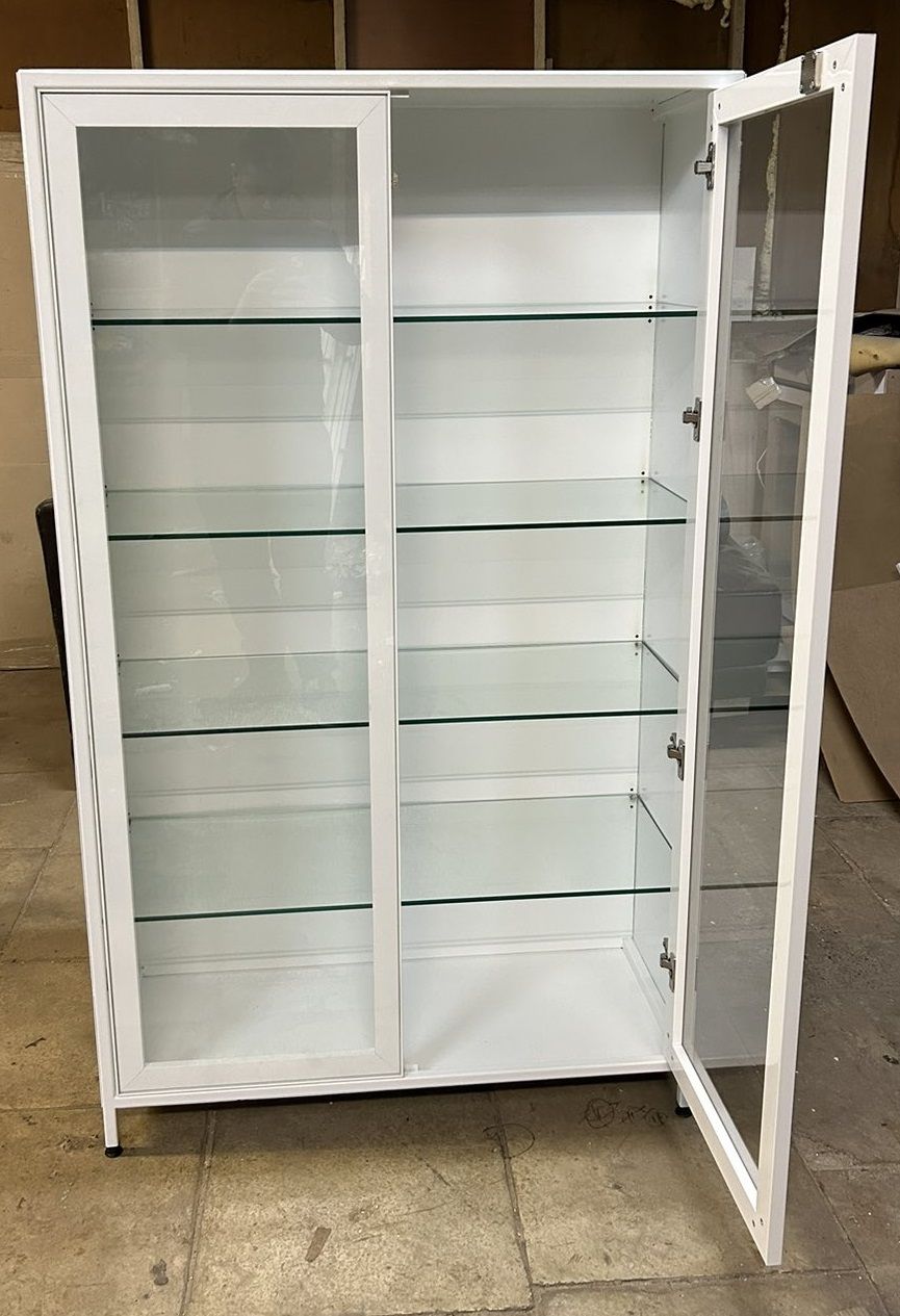 Шафа являє собою двостулкову металеву конструкцію, встановлену на ніжках з регульованими опорами. Шафа обладнана чотирма скляними полицями. Двері шафи скляні в алюмінієвому профілі із замком. Шафа виконана зі сталевої профільної труби 20х20мм та сталевого листа товщиною 0,8мм. Двері шафи виконані зі скла товщиною 4мм, полиці - зі сталевого листа товщиною 0,8 мм. Шафа пофарбована білою порошковою фарбою RAL, яка має антибактеріальні властивості та допускає обробку дезінфікуючими розчинами. Всі матеріали та комплектуючі, які використовуються при виробництві шафи, мають необхідні висновки та допущені для використання у виробництві медичних меблів.